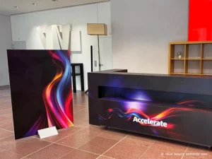 Impression sur bâche avec fourreau scratch + Impression sur adhésif mat contrecollé sur Shynaboard 3mm + Pied Wedge